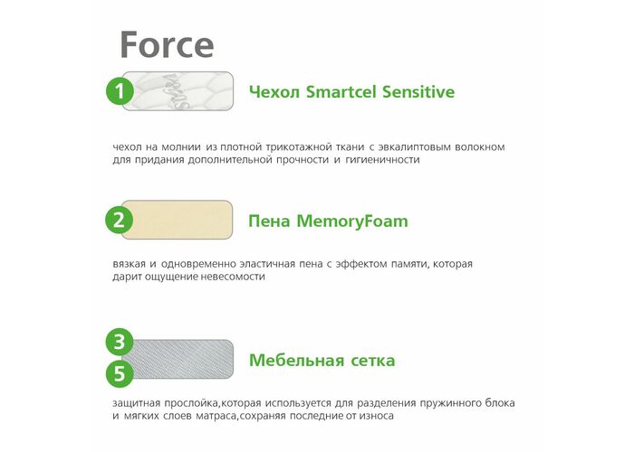 Инновационный материал с памятью формы, разработанный для нужд аэрокосмической отрасли. Обладает одновременно вязкостью и эластичностью, что дарит спящему ощущение невесомости.
