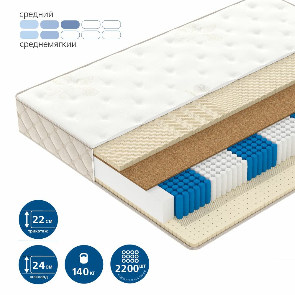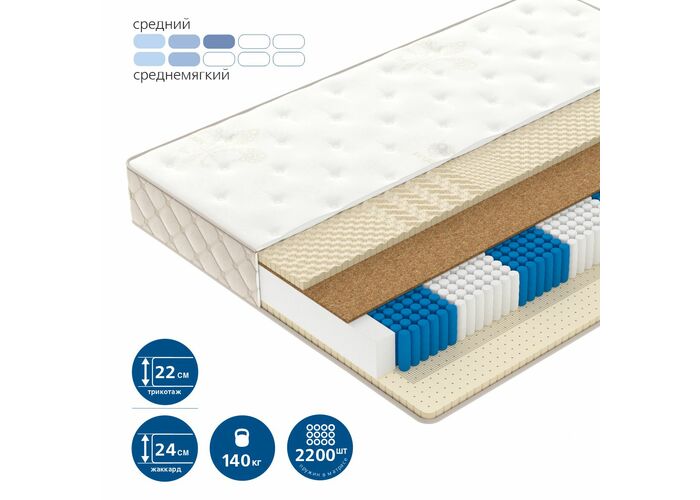 Блок независимых пружин Multipocket R2200 7-Zone (каждая пружина в отдельном чехле из спанбонда) плотностью – 2200 пружин в двуспальном матрасе. Блок независимых пружин из стали с выраженными 7 зонами поддержки. Чередование упругих и более мягких зон учитывает анатомию тела человека, а небольшой диаметр пружины усиливает ортопедический эффект, плавно распределяя нагрузку по всей длине матраса. Диаметр пружины 40 мм.