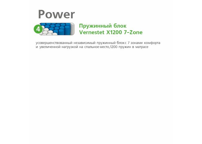 Блок независимых пружин Vernestet X1200 7-Zone (каждая пружина в отдельном чехле из спанбонда) плотностью – 1200 пружин в двуспальном матрасе. Усовершенствованный независимый пружинный блок с 7 зонами комфорта и поддержки во время сна. Пружины расположены в виде пчелиных сот, что увеличивает плотность их размещения, повышая ортопедический эффект и допустимую нагрузку на спальное место. Диаметр пружины 60 мм.